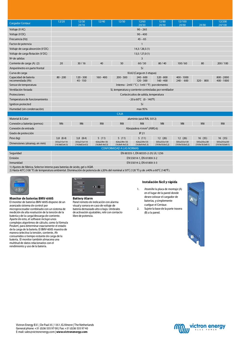 El cargador Centaur se debe instalar en un lugar seco y bien ventilado. Una temperatura ambiente demasiado elevada puede ocasionar una disminución del cargador o su paro, además de reducir su duración de vida.
